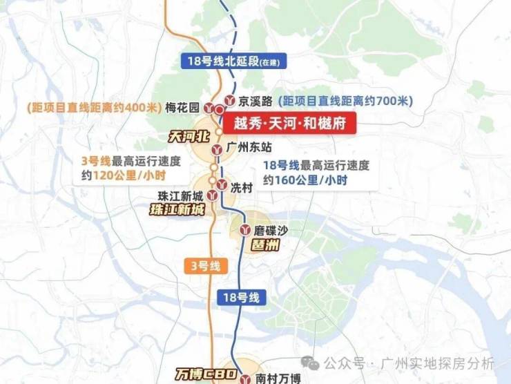 项目距离地铁3号线梅花园站直线距离仅400米左右,步行约800米,2站直达林和西,4站就能抵达珠江新城。附近还有在建设的18号线北延段京溪路站,1站可到广州东站,5站直达琶洲。