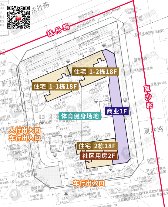项目由3栋住宅+商业+社区用房组成,商业位于东侧,社区用房位于2栋南侧,住宅皆楼高18层。
