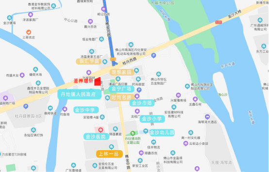 根据区位图可知,项目临近桂丹西路,包括有丹灶镇行政服务中心、金宁文化广场、金沙中学、金沙小学、金沙幼儿园、金沙医院、金沙市场。