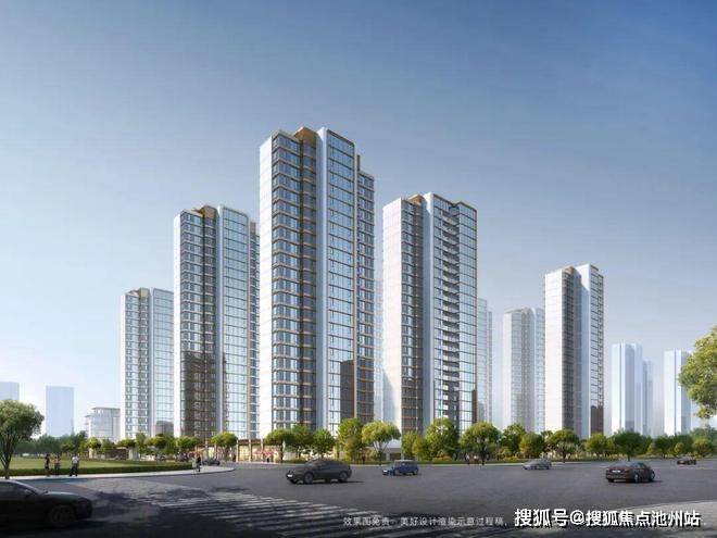高层楼幢以大面玻璃+香槟金色铝板为立面主建材,金色线条从顶冠向下延伸,勾勒出建筑的挺拔轮廓,彰显出简约而现代的视觉冲击力。