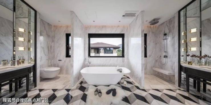 公望的合院E户型,虽然建筑面积只有约250-270㎡,但也同样如此。双台盆在高端住宅里已经很常见了,但一左一右的对称型布置,极少;视线的焦点会是中间的浴缸,沐浴区和马桶区对称地分设两端;比永利皇宫的套房更难得的是,主卫的墙面正中间,还有一扇雅致的玻璃窗。