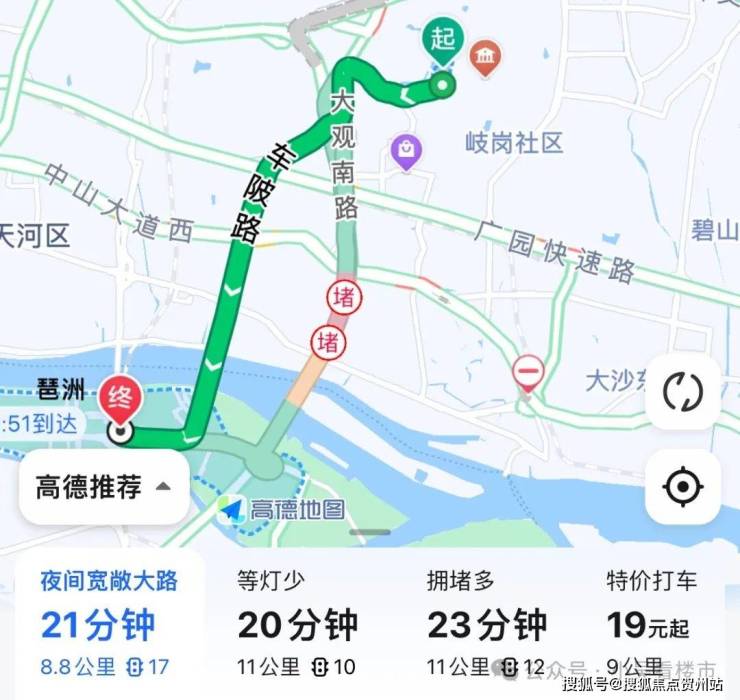 自驾去往琶洲:悦景路转到奥体路,再转车陂路,最后转新港东路,全程8.8公里,耗时21分钟左右。