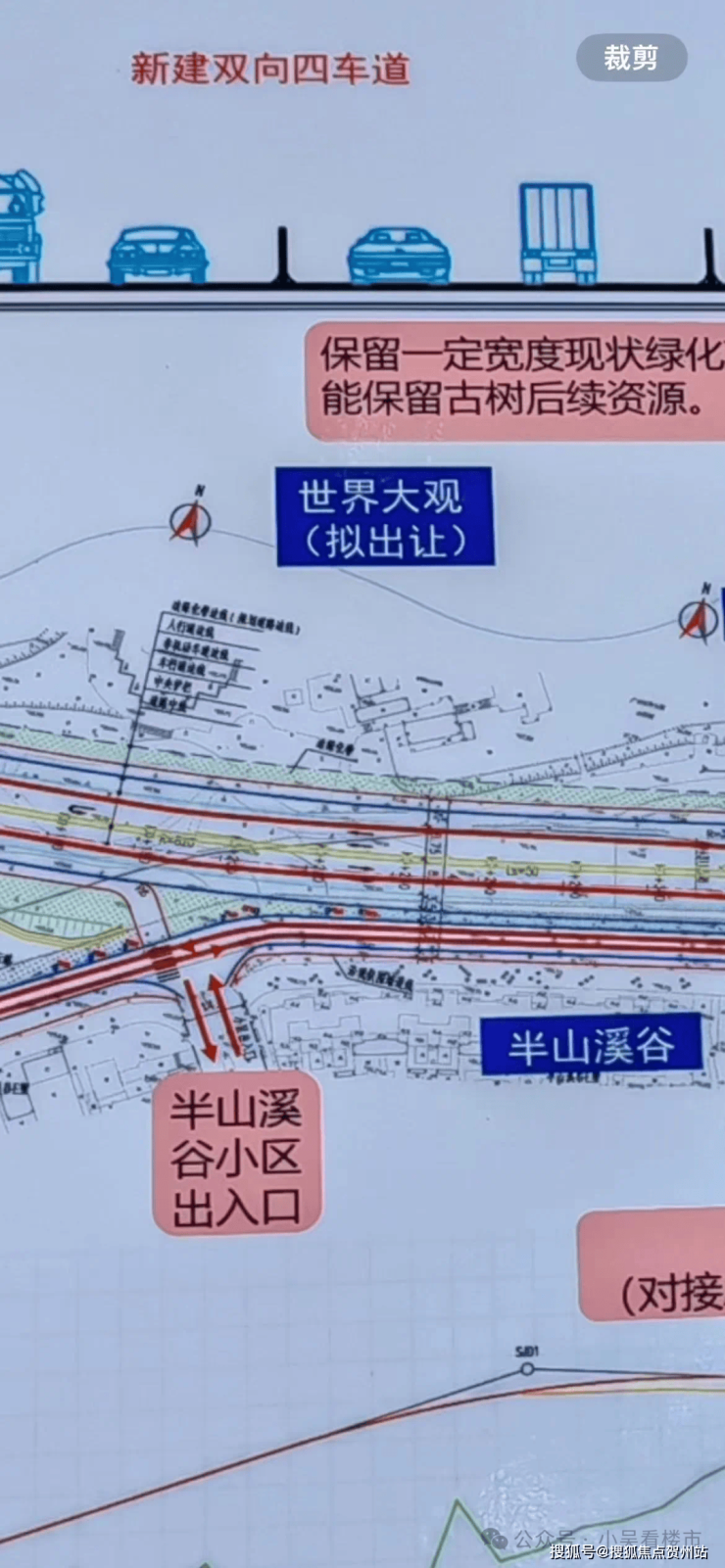 此前,周边居民主要的反对点,就在于悦景路的半山溪谷路段,太过靠近居民楼,未来噪音严重影响生活;这不,这次就将原道路拓宽,改造成为在现有道路北侧,新建双向4车道,并且保留现有植被绿化;将原本约6.4米的噪音敏感点,北移至距楼体25米以上,同时,在建设上安排下沉3.4米,这比加装隔音屏更美观,且降噪效果大大加强。