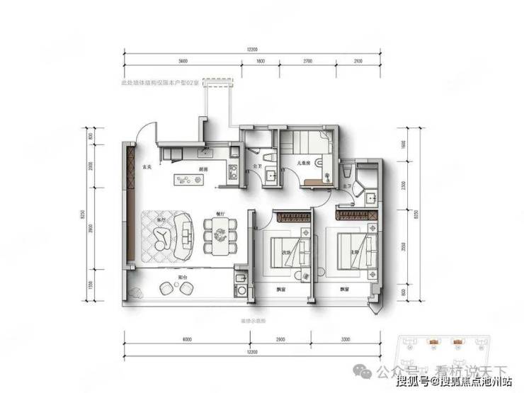 该户型为三房两卫格局,主要位于6、7号楼中间套。是市面,上比较难得的四开间朝南户型,动静分区,整体舒适。餐客厅横厅设计,其中厨房做到了中西双厨设计,实用性很强。客餐厅朝南连接长约6米的南向阳台。整体南向面宽达到了约12.2米,采.光和景观面更佳。