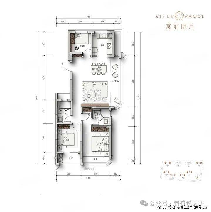该户型为三房两厅两卫格局,主要位于1、2、3、4、5、8号楼边套,市面.上类似面积段的房源,几乎都是中间套,棠前明月设计成清一色的边套, 居住舒适度更高。入户玄关、U型厨房、双阳台、两房朝南、主卧套房飘窗和收纳空间等,跟市面.上大户型边套相比该有的都有。其中- -体化餐客.厅带长约6米的超大封闭阳台,大面积的落地窗,可以直接俯瞰楼下美景。