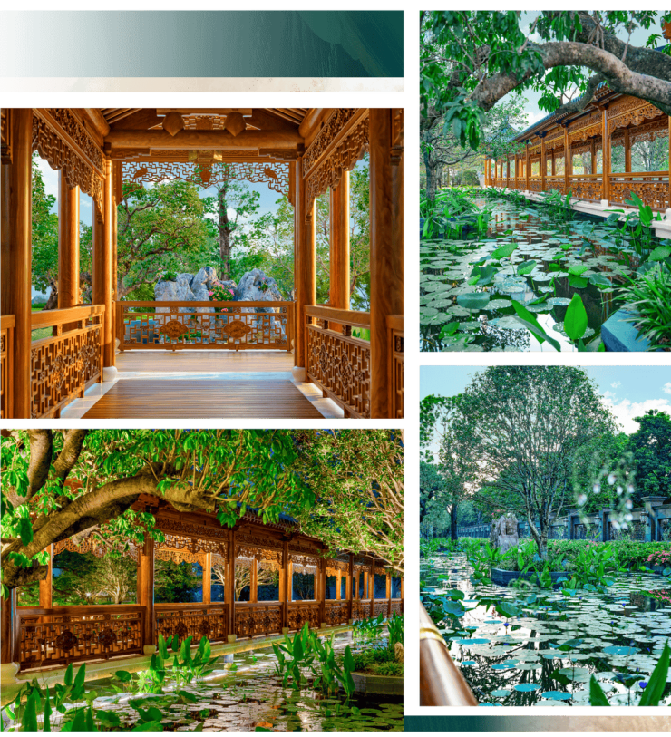 西北处,则是星河湾前所未有的水系恢弘园林,其中有荟萃中国晋徽园林菁华的古典建筑群,以连绵曲折的连廊为脉络,赋予雅致古拙的园林诗意;亦有近水宜人的自然绿植,数以万计的碧荷充盈其中,入眼即是自然绿意。景观顶级而又臻稀多样,放眼广州乃至全国,都实属罕见。