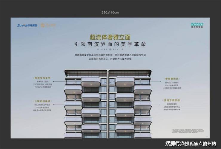 270°曲线弧度美学,构建超流体奢雅立面,毫米级精工细节、奢宅级窗地比、大面积光感玻璃,精致双层线条,搭配古铜金+葡萄牙米白的色彩点缀,传达出超越时间的雅奢质感。