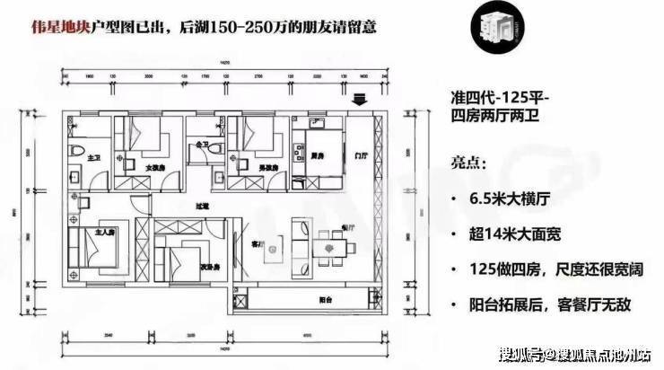 125㎡2四房横厅6.7米开间+独立电梯入户,主卧套房设计提升私密性