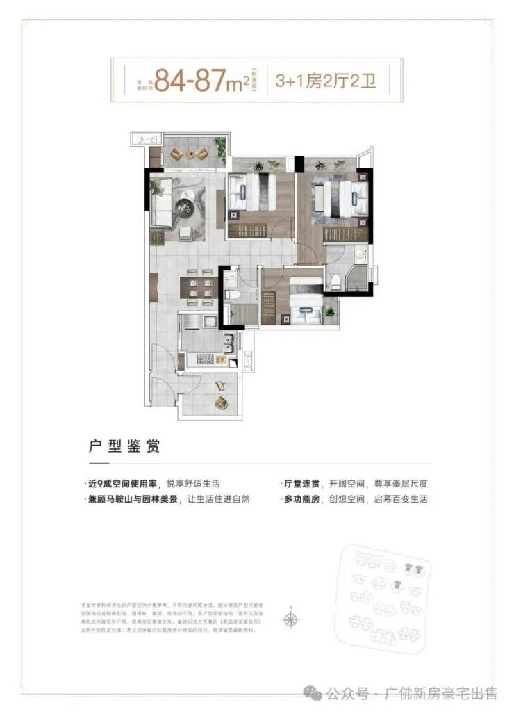 ①、出售面积:84平米3+1房2卫2厅,总价506万起