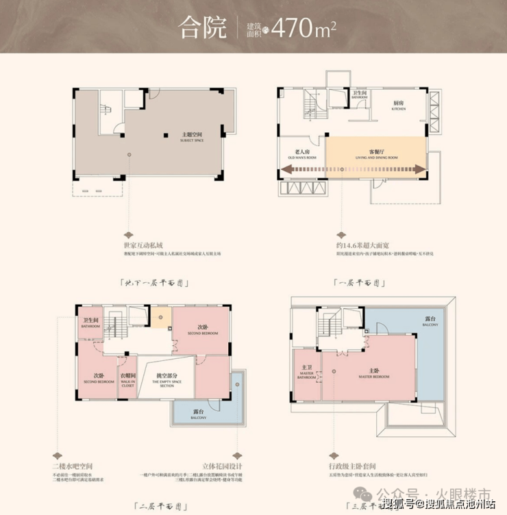 合院470㎡:整个小区仅规划10套,单层开间15.6米,二、三楼L型露台。