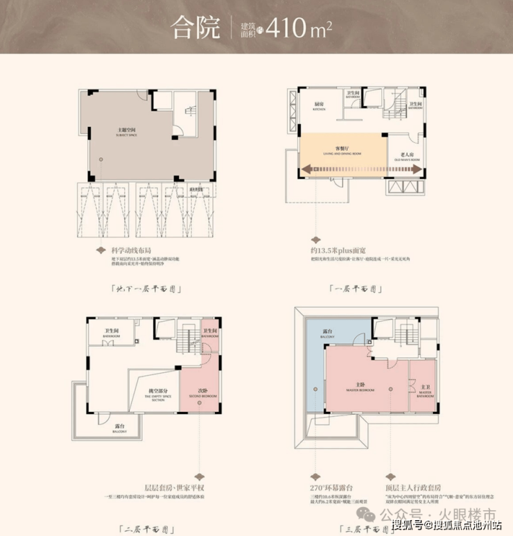 合院410㎡:整个小区共规划22套,单层开间13.5米,二楼L型露台,三楼270°环幕露台。