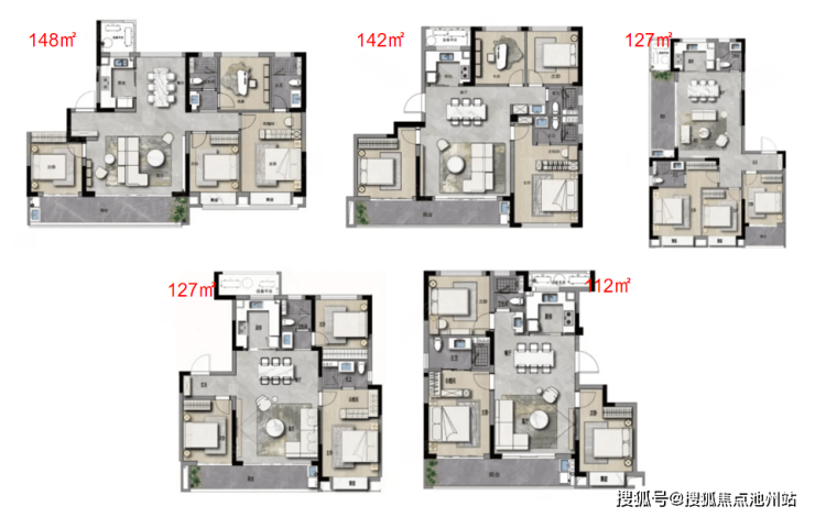 本批次户型有112/127/142/148㎡,包含刚需到首改。148㎡户型优质,其他4个户型较常规。