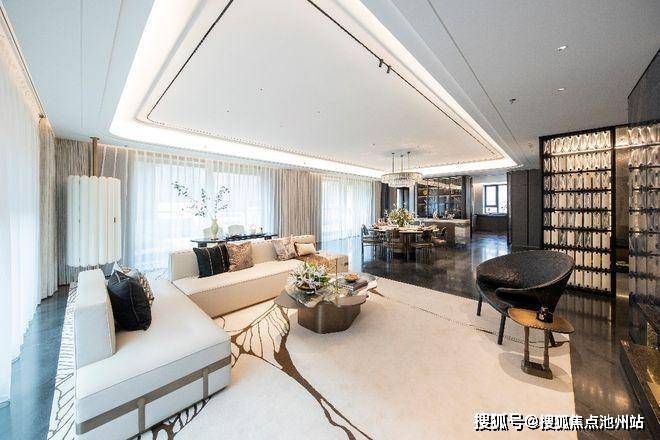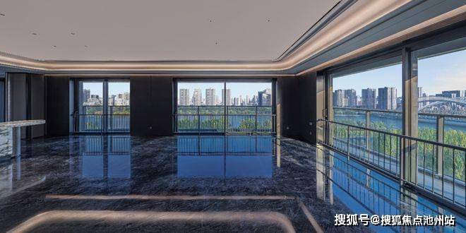 步入室内,LDK 一体化格局带来开阔流畅的空间体验。客厅、餐厅、厨房相互贯通,毫无阻隔。奢阔宽厅尺度惊人,为家庭聚会、朋友宴请提供了充足空间。地面采用深灰色巴西乌金纯天然石材整铺,质感温润细腻,彰显不凡品质。电视背景墙选用稀有的海洋之心天然奢石,其独特的纹理与色彩,宛如海洋深处的神秘宝藏,瞬间为整个空间增添了奢华大气的格调。再搭配 270°环幕落地窗,室内外景观得以完美融合,向内可将晋风园林的典雅精致尽收眼底,向外则能纵览汾河一线壮美河景,四季更迭,美景如画,仿佛将自然的诗意融入生活的每一刻。
