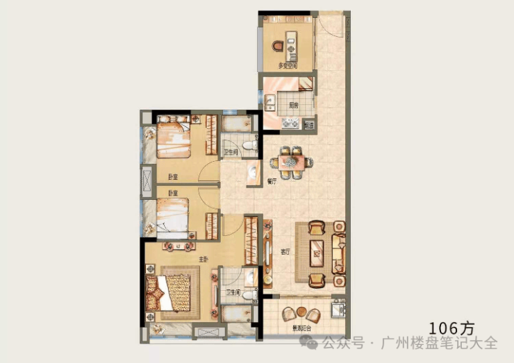 <户型C,三房两厅两卫,建面约106㎡>