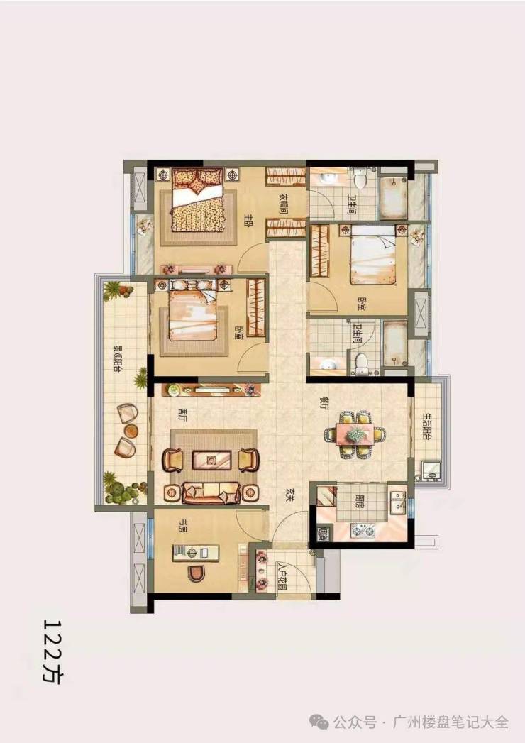 <户型E,四房两厅两卫,建面约122㎡>