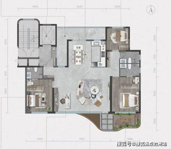 1、在户型的东西端厅位置,设计了6.5米层高的竖厅;
