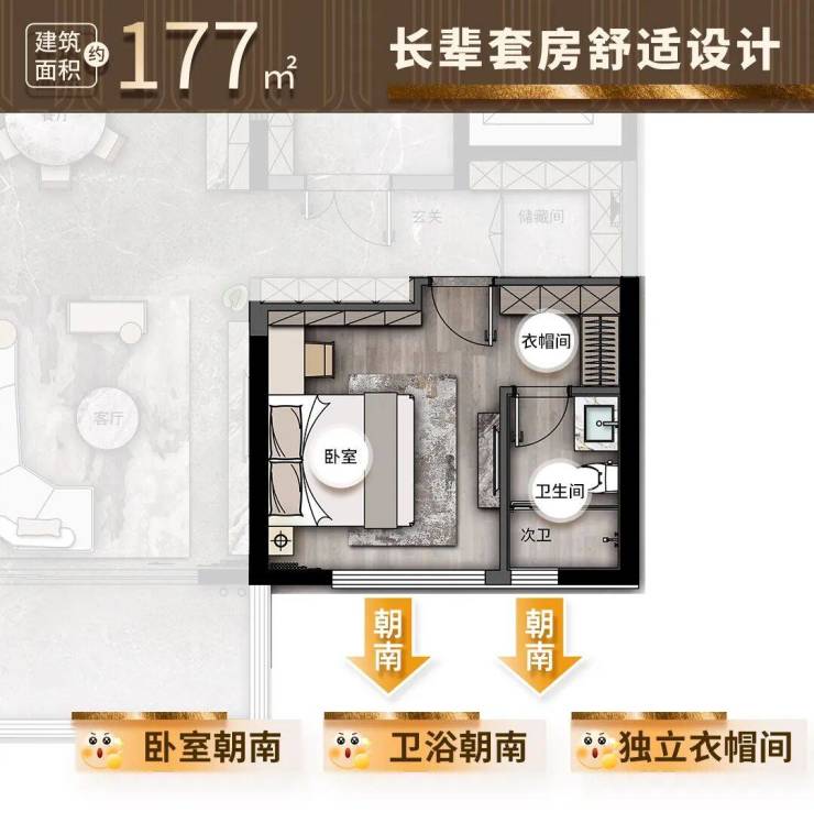 长辈套房,卧室、卫浴都朝南,体贴照顾长辈的居住健康;还留足空间多做一个独立衣帽间,带来舒展的空间体验。