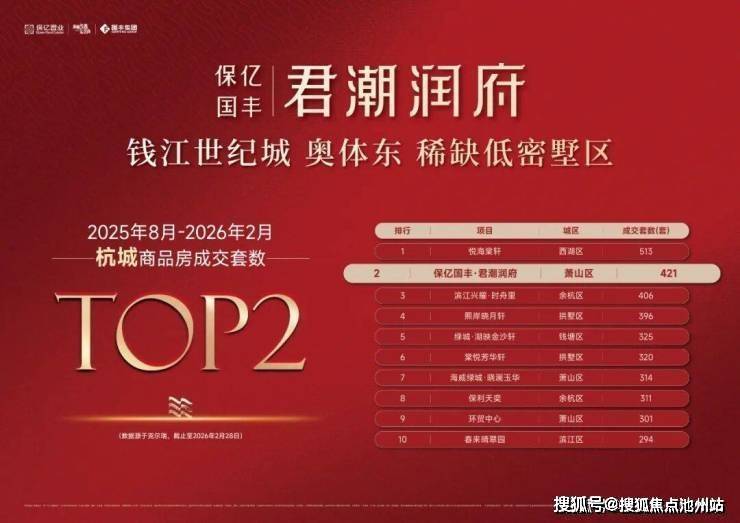 当多数项目还在为“如何破局”发愁,君潮润府已悄然完成了一次质的跨越——自2025年8月入市至2026年2月底,项目不仅稳坐萧山区销冠,更一举跻身杭城商品房成交套数TOP2。(数据来源:克尔瑞,截至2026年2月28日)