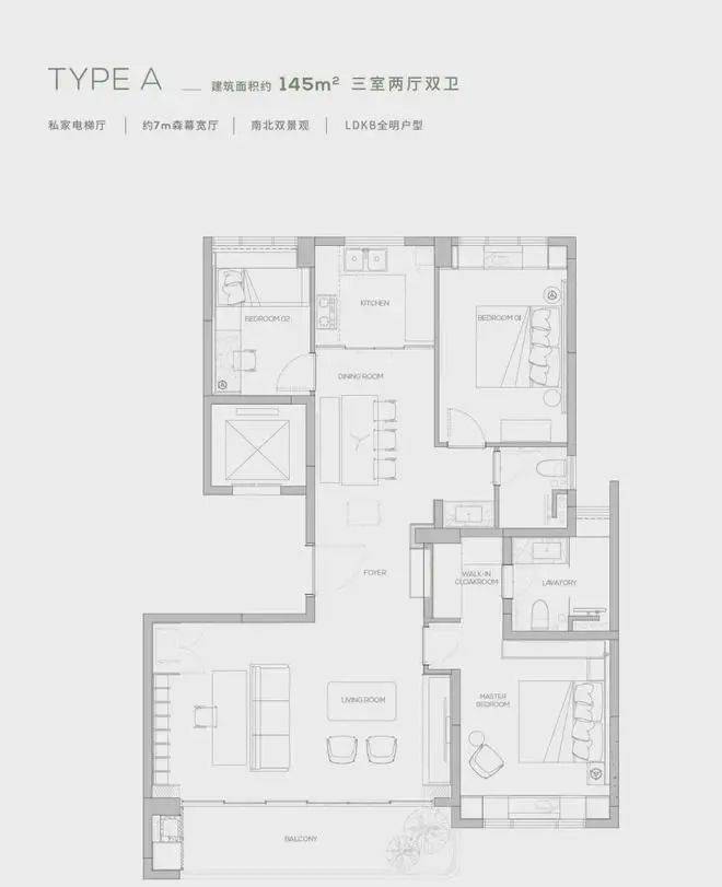 145㎡三房两厅两卫:餐厨一体化设计,7.1米南向宽厅,LDK全明布局,适合年轻家庭。