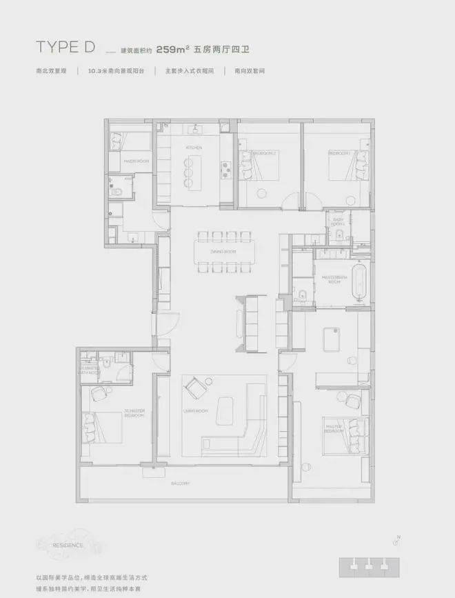 264㎡五房四卫:10.3米南向景观阳台,主套步入式衣帽间,6.6米方厅,专属家政空间。