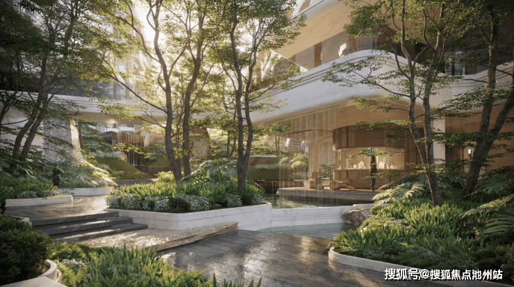 高大乔木与层叠绿植交织成天然绿廊,跌水瀑布与水幕帘潺潺流淌,将安缦式度假感藏进日常,让归家成为一场穿越森林的旅行,把都市喧嚣彻底隔绝在外。