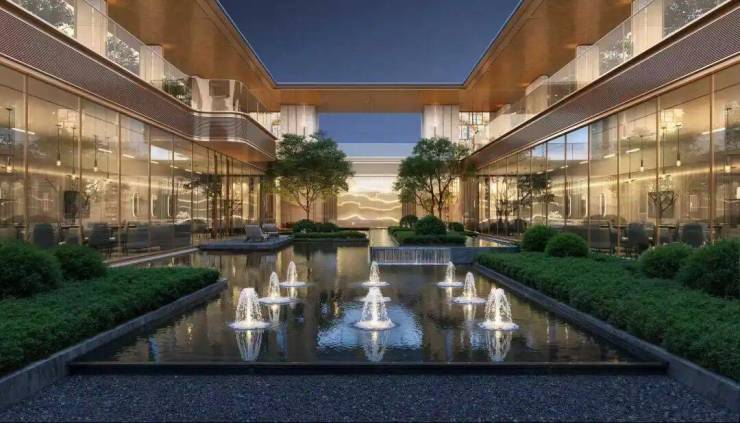 园林同样大手笔,打造出建面约13000㎡中央大花园,约等于30个标准足球场,其通过“一轴·两环·五核心·多花园”的空间布局,再现酒店微度假情境下的定制化园林生活意境。