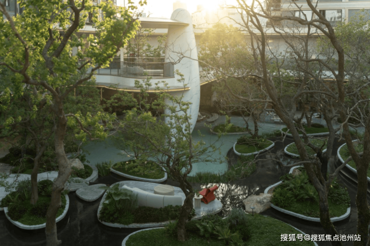 4600㎡主入口景观前场,结合水景与树阵的穿插,熟悉与烟火交织,让回家变成慢慢松弛的归途,充满仪式感。双层景观体系,成就世界顶级酒店虹夕诺雅野奢感。