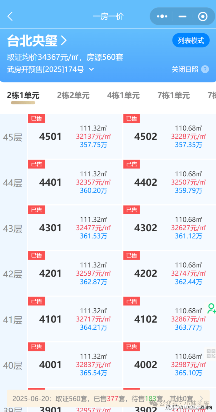 已网签完毕的1号楼备案均价33080元/平,2号楼33276元/平,4号楼35974元/平,6号楼34152元/平。