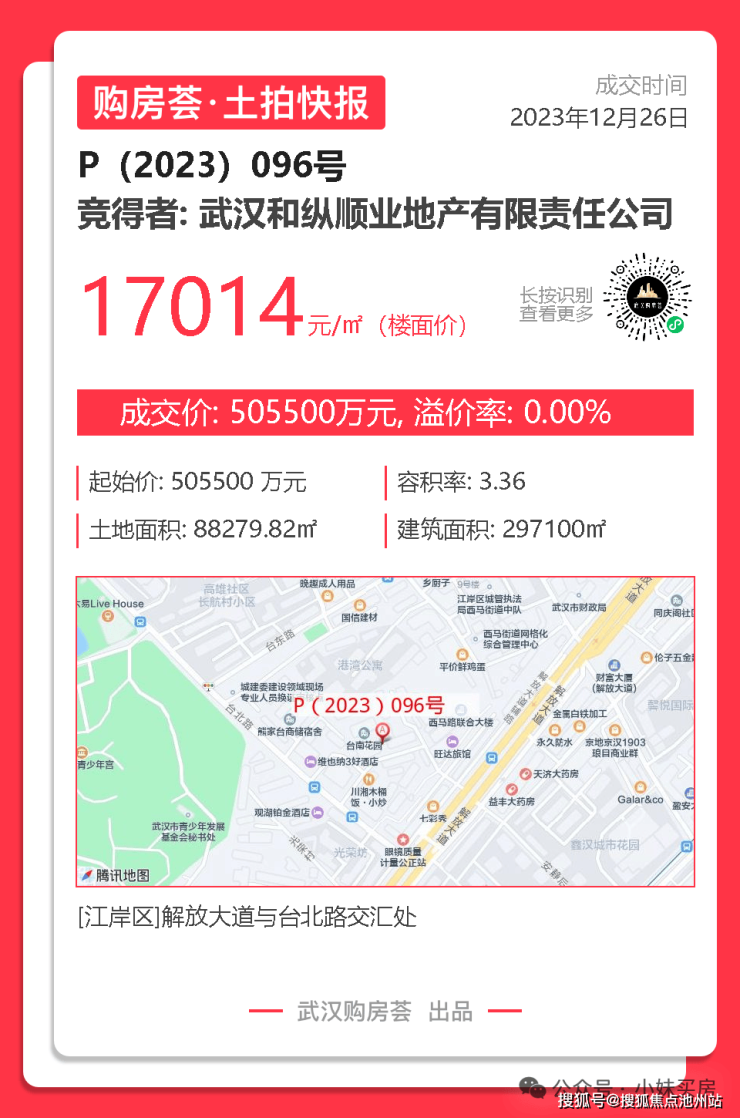 台北央玺是2023年12月26日,武汉和纵顺业地产有限责任公司底价竞得的P(2023)096号地块,成交价为505500万元,成交楼面价为17014.5元/平。