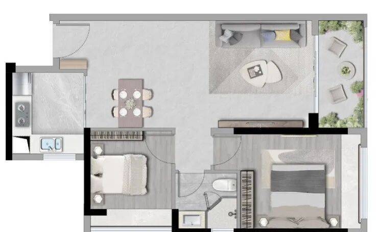 【72㎡2房2厅1卫】高实用空间,动静分区科学布局全屋优越采光,推窗即揽诗意山景餐客一体,连通阳台 延伸幸福尺度L型厨房,动线流畅让烹饪更自在。
