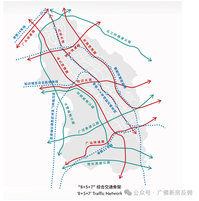 🎢花莞高速无缝接驳城芯干道,约30分钟直达珠江新城,快速通达全城规划8⃣条轨道5⃣条高速7⃣条快速路,多维立体交通,打造湾区1小时生活圈🚇8条轨道地铁14号线、地铁14号线知识城支线、地铁21号线、新白广城际线(在建)、白云机场联络线(规划中)、37号线(规划中)、广中珠澳线(规划中)、广河高铁(规划中)、有轨电车5号线(规划中)🚘 5条高速公路广河高速、花莞高速、北三环高速、从埔高速、增天高速🚗7条城市快速公路永九快速路、九佛快速路、智慧大道、知识大道、广汕快速路、广从快速路、知识城至生物岛快速路