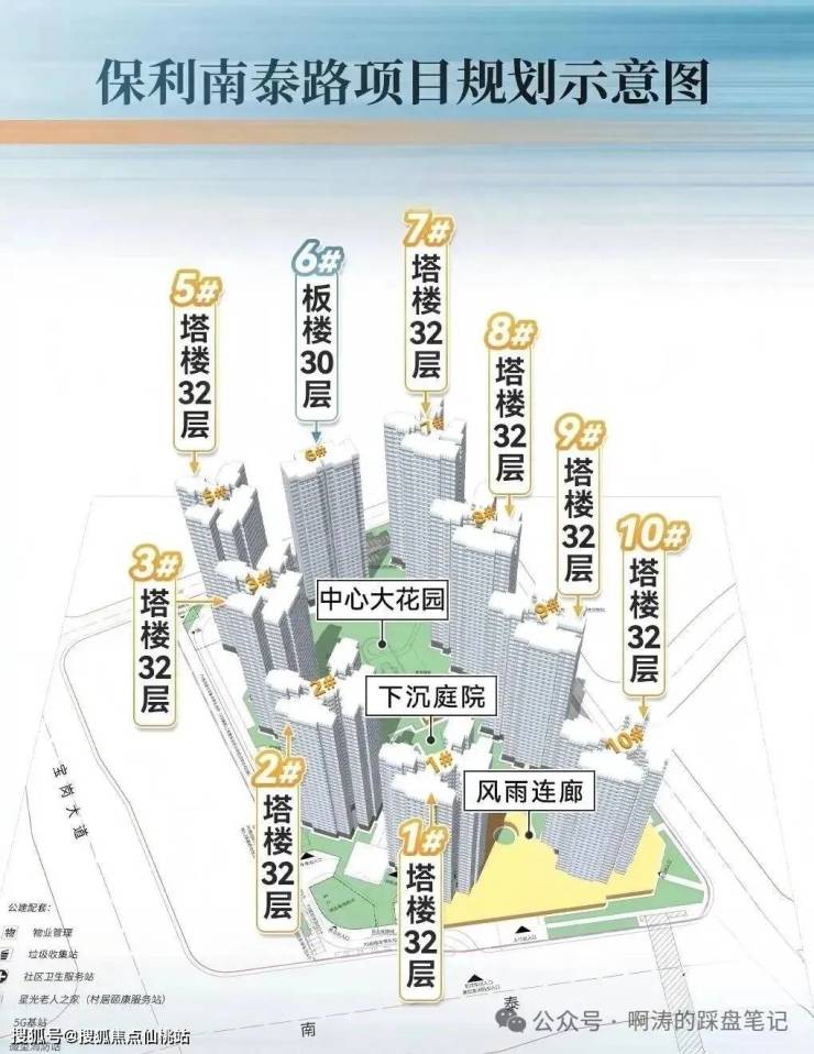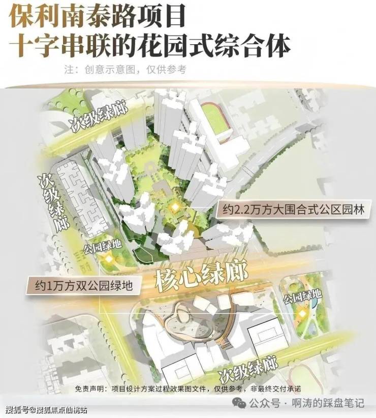 这条十字中轴沿着南泰路两侧展开,把地块南北两侧、住宅区内部的集中绿地串联,构建出约3.2万方社区内大花园 + 外部双公园结构;