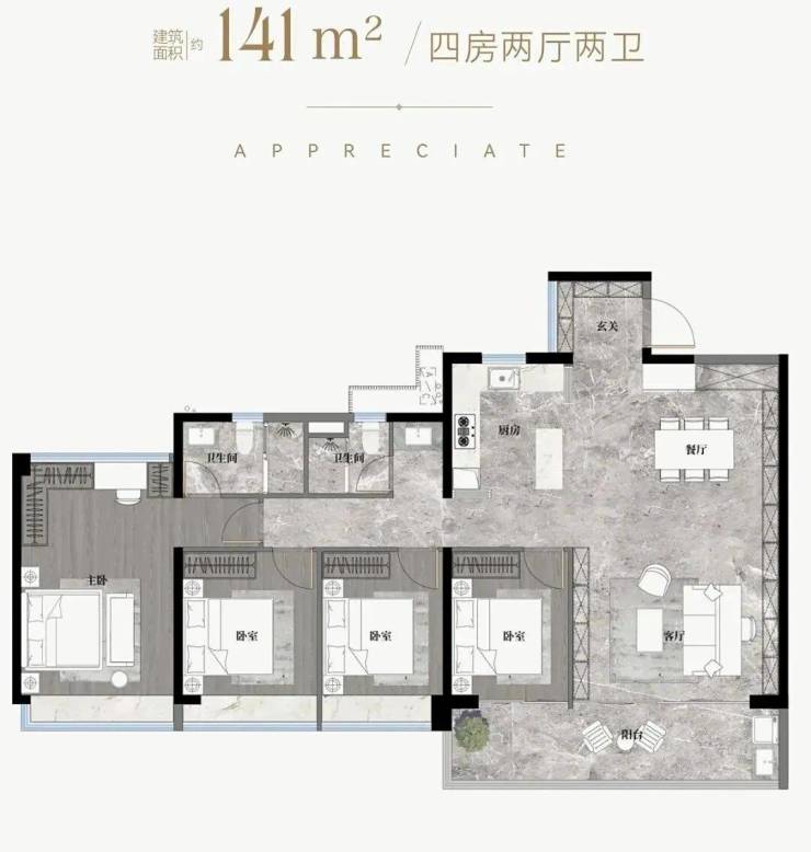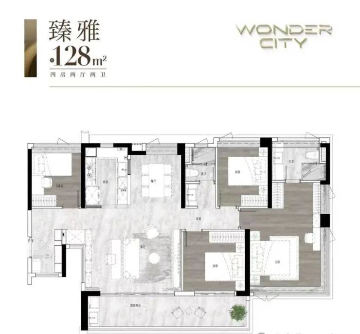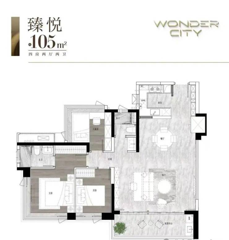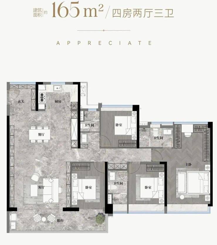 二期的10#,位置在小区中间,更加安静,定价比起去年卖的一期贵,当然,使用率方面,跟一期比起来也做了进一步提升,算上花池、阳台跟飘窗等赠送面积,使用率接近130%,主力的户型只有两个,分别是建面约105m²的四房和建面约128m²的四房。