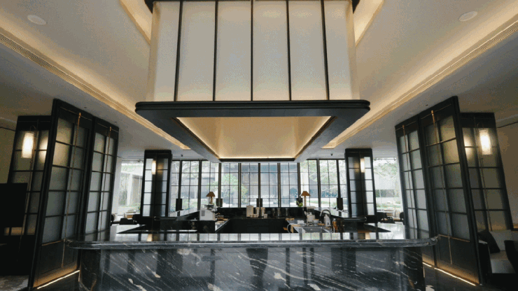 项目共规划约7.2万㎡超级中央园林,目前已开放实景园林。入户大堂以宝格丽酒店设计风格为灵感,搭配约7米高的艺术移门和奢石弧形墙面,高级感满满。