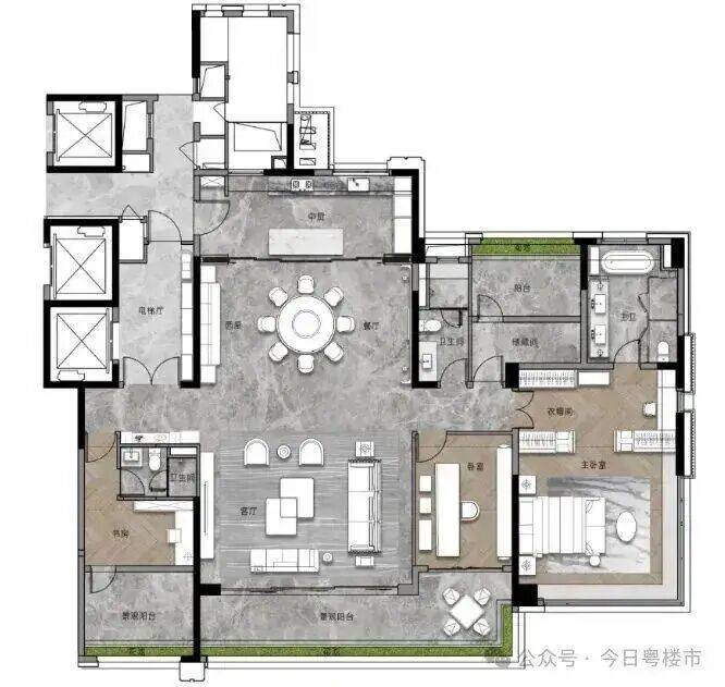户型整体采光面的阔绰:该户型本身,就坐拥项目中至为宽敞的前后楼间距,还通过采光面的充分打造,让室外的景观、采光,都为室内所拥有。