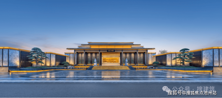 主入口约63米恢弘门庭,取形《仙山楼阁图》的五间一启门,以蓝翡翠奢石、艾伦蓝奢石、绿野仙踪等奢石映照门第,威严石雕麒麟静守两侧,百年罗汉松礼迎、七阶入门寓意其间。约32.8米宽飞檐与约11.2米高屋脊,以重檐坡顶勾勒天际线。重檐坡屋顶之下,非遗漆画《姑苏繁华图》迎卷而展,姑苏人文气度于此不彰自显,祥瑞之意敬呈归家礼序。