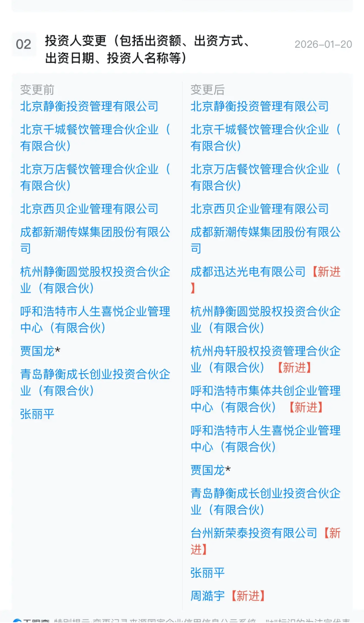 据悉,投资方包括台州新荣泰投资有限公司、呼和浩特市集体共创企业管理中心(有限合伙)、成都迅达光电有限公司、杭州舟轩股权投资管理合伙企业(有限合伙)等四家企业和自然人周澔宇,融资金额尚未对外披露。