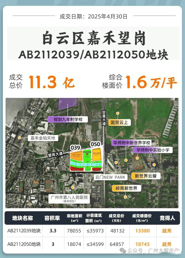 2025年4月30日,越秀地产在土拍市场杀出重围,拿下了嘉禾望岗两个地块。AB2112050地块,AB2112039地块,折合楼面价分别为1.87万/㎡和1.34万/㎡。