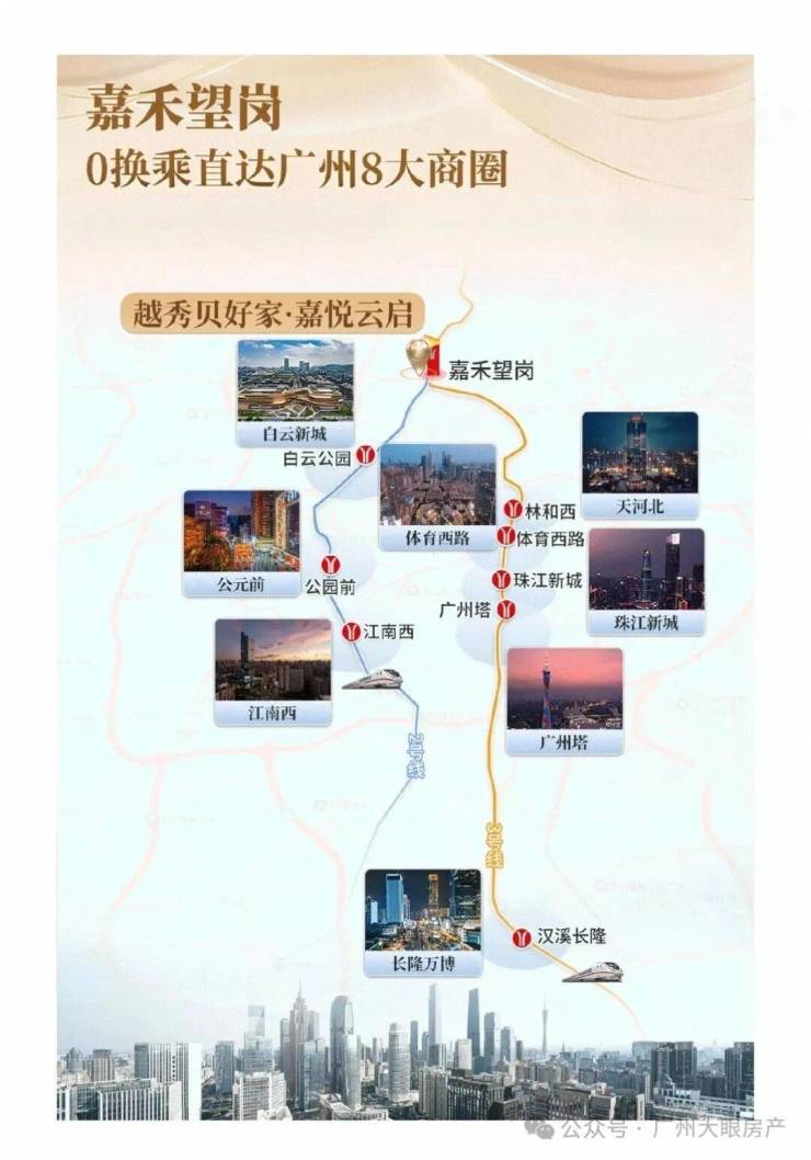 通过2号线,3 站直达白云新城(萧岗站),9 站畅达老城中心越秀公园、纪念堂,无缝连接北京路等繁华商圈;