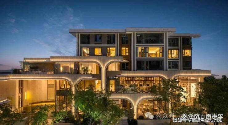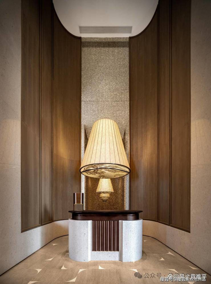 社区主入口提炼自温州榕树的“树冠精华”,经过创意抽象重构,形成了一幅延绵约80米的“超级树冠”艺术界面。这一界面巧妙地消除了城市与楼盘之间的界限,成为一道独特的风景线。置身其外,人们可享受到超广角视角下的街景长卷。同时万科参照五星级奢华酒店,打造环岛迎宾、登堂入室的双重归家礼仪,营造出“每一次归家,都是一场度假”的尊贵体验。材料方面弧形部分采用的是雨果石,中间整块的安第斯雪景奢石。