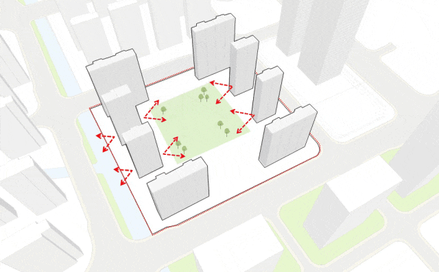 整体围合式的布局很好地限定了基地内部和外部界面。通过中心两栋点楼的植入,将场地划分为南北两个超大尺度中心庭院。