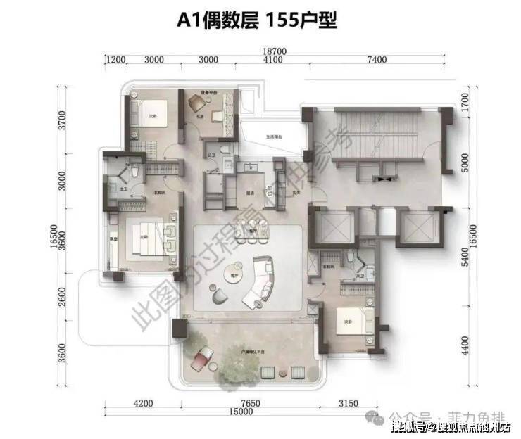 设计:全部架空层(层高5.1米),空中花园错层布局,南北双露台,客厅面宽达7.65米。