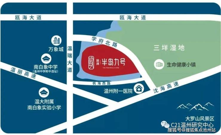 远洋·半岛九号(备案名:天澜源筑)位于瓯海区南湖板块,即温瑞大道与学府北路交汇处,东面紧挨着三垟湿地。