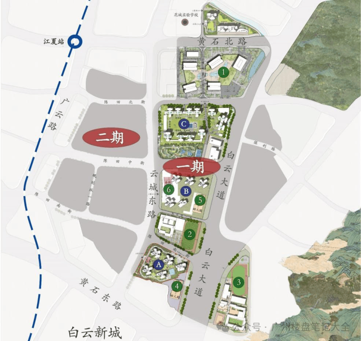 卖点三、城市枢纽, 畅达全球: 横跨双地铁, 东邻白云大道, 西至广云路, 北接华南快速, 南接内环路、广园 快速, 15 分钟达越秀老城区、20 分钟即达珠江新城。投资 440 亿广州白云站距离项目 3.5 公里, 中 国在建最大火车站、广州三大特级交通枢纽之一、亚洲流量之王。