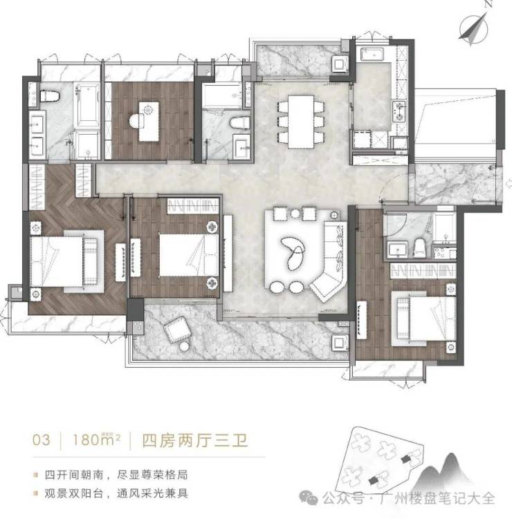 卖点一、云山头排,臻藏豪宅:落位云山西麓, 直面主峰摩星岭, 0 距离山景, 片区内真正唯一云山头排豪宅。 坐享“市肺”疗养级生态环境, 广州不可复制稀缺资源。千年帝王风水龙脉,一城权贵聚居之地。