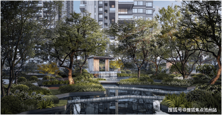 徜徉其中,犹如城市微度假的悠闲惬意,水景、浮岛、林屿、花园、草坪……不同的场景交织,犹如公园般的城市微生态景观。