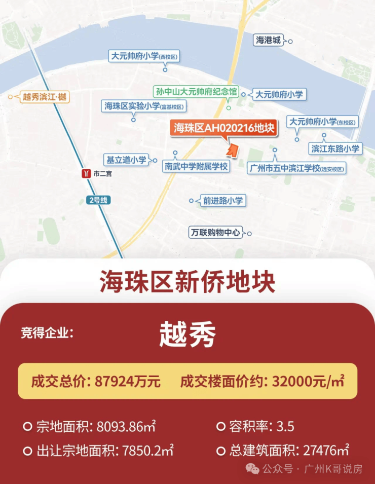 2025年1月底,越秀地产以总价8.79亿、折合3.2万/平的地价拿下地块,拿下2025年广州土拍第一拍。