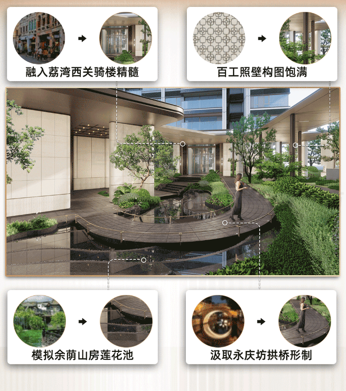 项目汲取岭南名园的灵感,在园林融入前庭后院、园中有园的造景技法,为业主带来移步换景的精神享受。