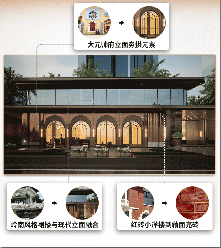 取自百年大元帅府立面的劵拱元素,广州人来到第一眼就会有亲切感。