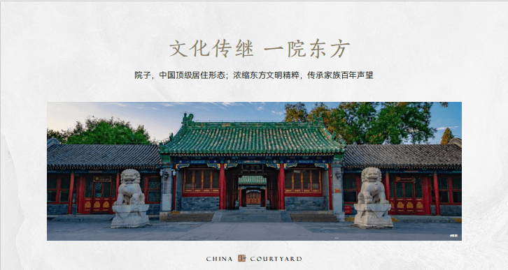 院子,不仅是中国人居的至高礼制,更是内在血脉文化的基因。在西式建筑盛行、欧风美雨侵袭的当下,时代正在呼唤一座院子,担起唤醒东方文化记忆的使命,弥补中国人文建筑精粹的缺失,让国人重拾庭院情怀。